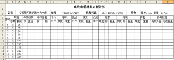 Microsoft office Excel可以用于電線電纜材料定額的批量計算。以YJV22-0.6/1kV三芯電纜的計算為例,計算框架示例如圖3:
